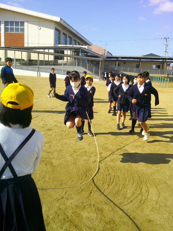 今、子どもたちは長縄をがんばっています。これは、菊池郡市の小学校みんなが、「8の字跳びに挑戦しよう。」という取組で、3分間で跳んだ回数を競います。