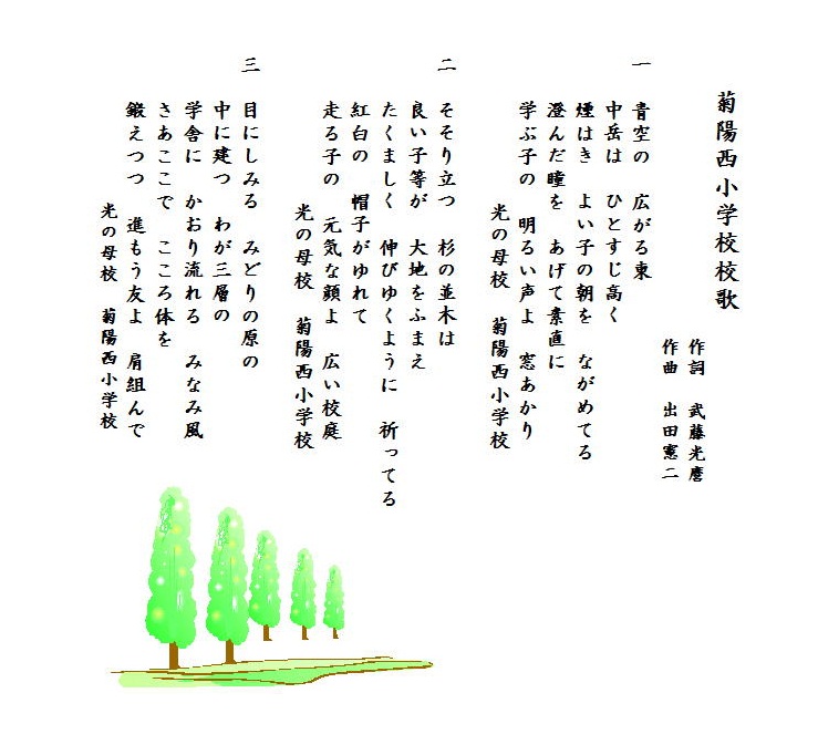 菊陽西小学校校章 太陽の光を受けて、明るく杉が大地に脚を張って、天を望み 考案者 相馬 正道(下原) |