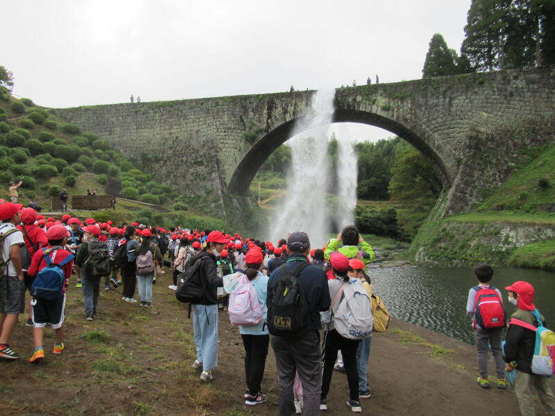 子どもたちは通潤橋の水を供給する仕組みや布田保之助をはじめとする白糸台地の人々の思いなどを実際に現地に行って学んできました。通潤橋の放水も見ることができ、その迫力を体験することができました。