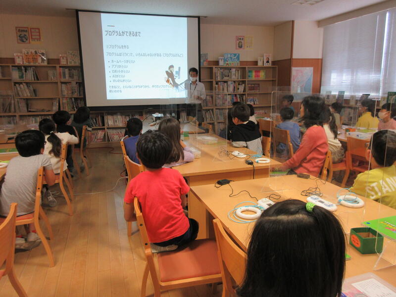 10月20日(金)、情報技術短期大学の坂田先生、小田先生、学生の皆さんをお招きして「トイオ」を使ったプログラミング学習をしました。子どもたちは、「進む」「止まる」「右折」「左折」のカードを組み合わせ、ロボットにプログラミングしてミッションをクリアしていきます。ゴールまで行けたら成功です。レベルアップしていくミッションにも果敢にチャレンジする子どもたち。失敗しても、その原因を探して、あきらめずにまた最初からチャレンジしていました。みんな楽しみながら、プログラミングを学ぶことができました。