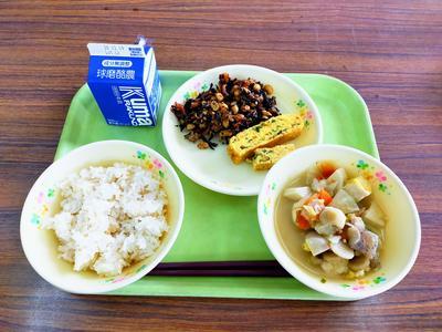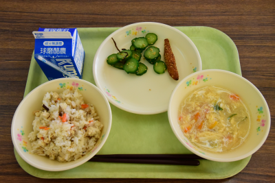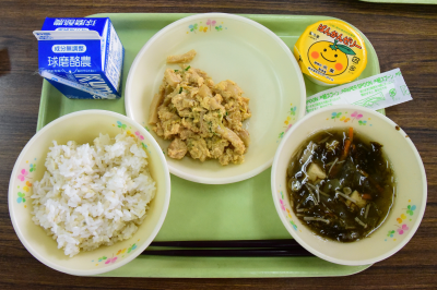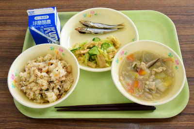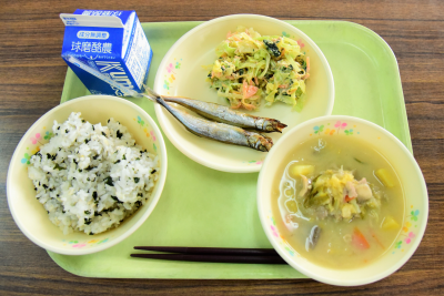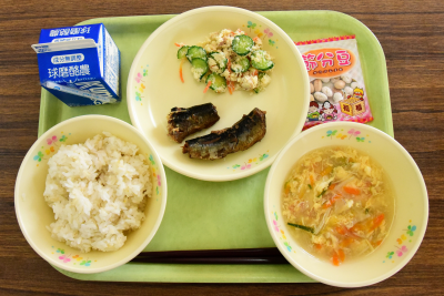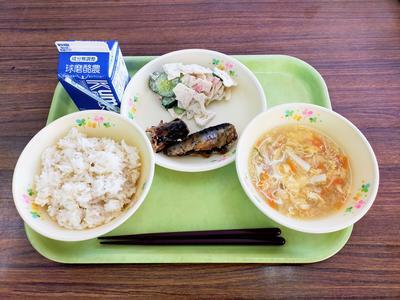 麦ご飯、イワシの甘露煮、うの花サラダ、かきたま汁