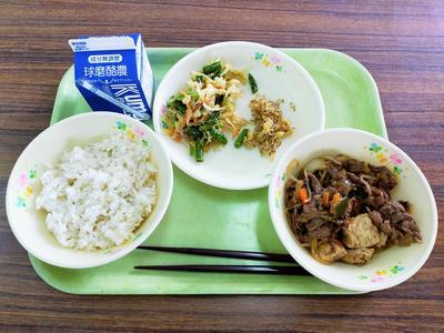 こぎつねごはん、牛肉のしぐれ煮、カリカリあえ、高野豆腐のみそ汁