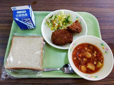 ココアパン、鶏肉のパン粉焼き、インディアンサラダ、ポトフ