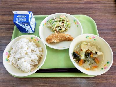 麦ご飯、魚のカレーなんばん、ちりめんナッツ、豆乳ぶた汁