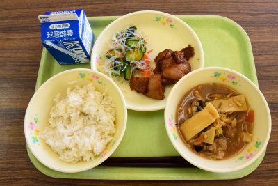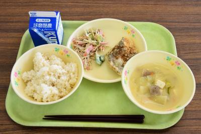 麦ごはん、魚の蒲焼き、ごぼうサラダ、みそけんちん汁