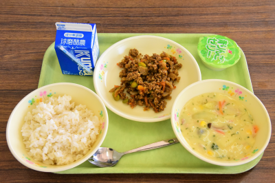 ドライカレー、コーンポタージュ、あおりんごゼリー