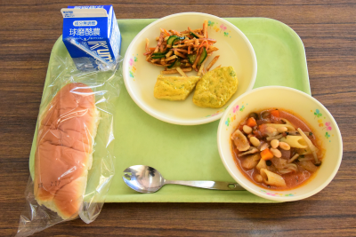 ミルクパン、オムレツ、揚げじゃがサラダ、ミネストローネ