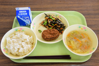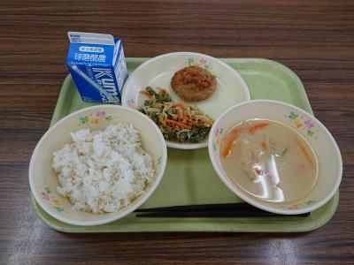 麦ご飯、豆腐ハンバーグ、いんげんのゴマ和え、白菜の味噌汁