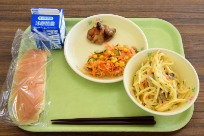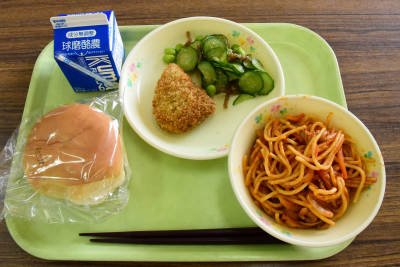 丸パン、スパゲッティナポリタン、カボチャコロッケ、枝豆サラダ