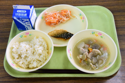 麦ご飯、さばのホイル焼き、ごしきなます、のっぺい汁