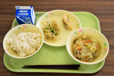 麦ご飯、ひじきシューマイ、八宝菜、もやしのナムル