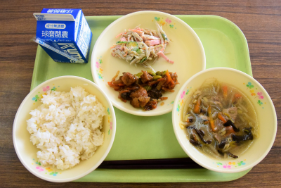 麦ご飯、鶏肉の韓国風てりやき、キュウリと春雨の酢の物、みそワンタンスープ