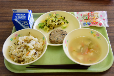 とりごぼうごはん、白玉だんご汁、揚げレンコンサラダ