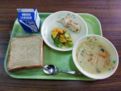 黒糖パン、魚のみそマヨ焼き、柿サラダ、白いんげんのクリームスープ