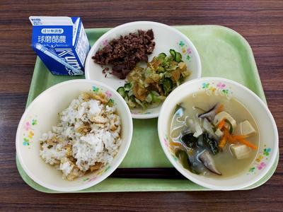 こぎつねごはん、牛肉のしぐれ煮、カリカリあえ、高野豆腐のみそ汁
