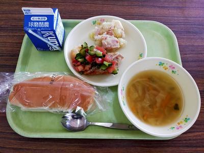 コッペパン、鯛のラビゴットソースかけ、ジャーマンポテト、コンソメスープ