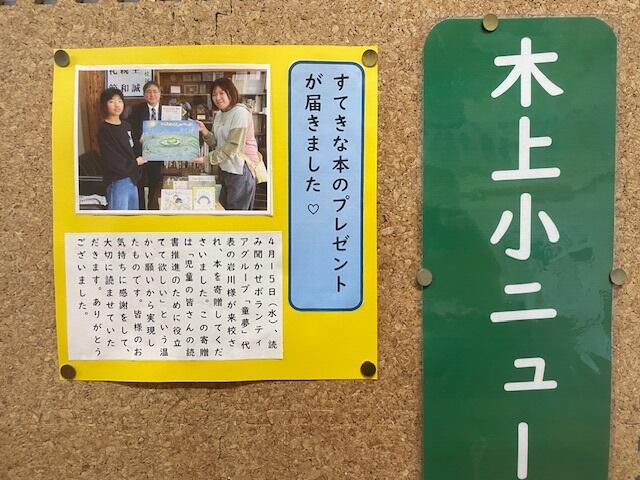 校長室前に「木上っ子ニュース」の掲示コーナーがあります。先日、読み聞かせポランティアの童夢様から書籍を寄贈いただいたことを紹介してありました。