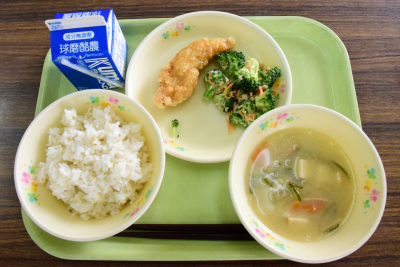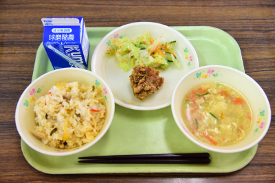 キムタクごはん、鶏肉のからあげ、ごまじゃこサラダ、コーン入り中華スープ