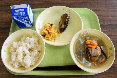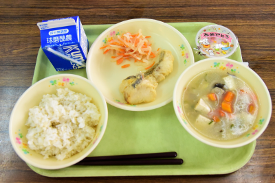 麦ご飯、サンマのみぞれ煮、彩りあえ、のっぺい汁