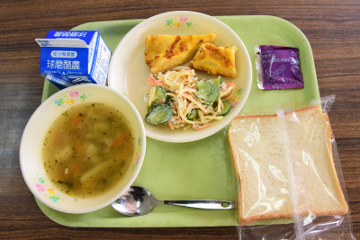 食パン、スパニッシュオムレツ、スパゲッティサラダ、コンソメスープ