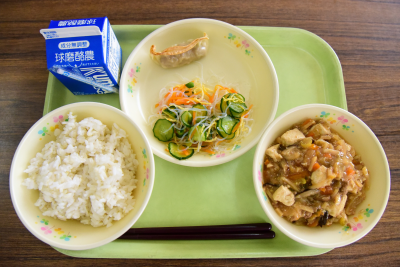麦ご飯、マーボー豆腐、焼きぎょうざ、バンサンスー