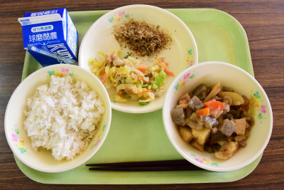 麦ご飯、うま煮、キャベツのゴマ和え、手作りふりかけ