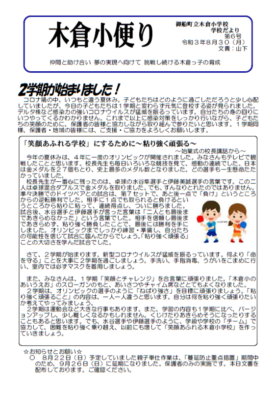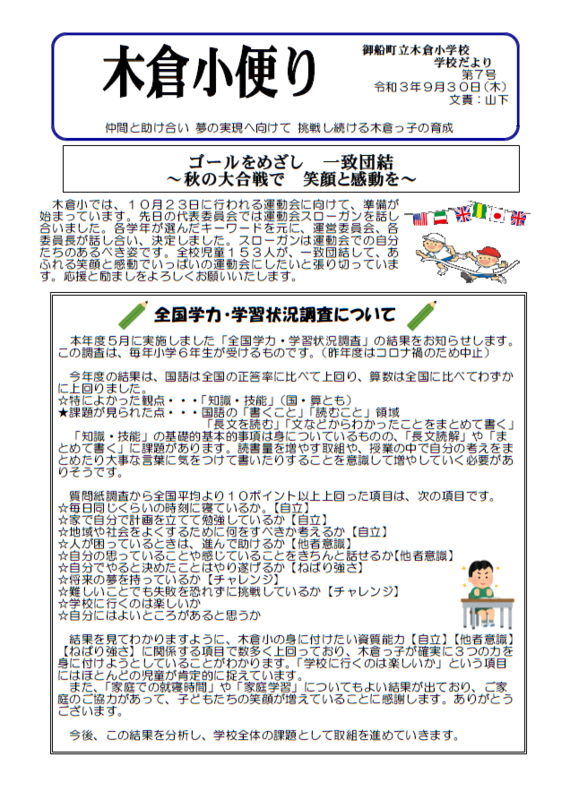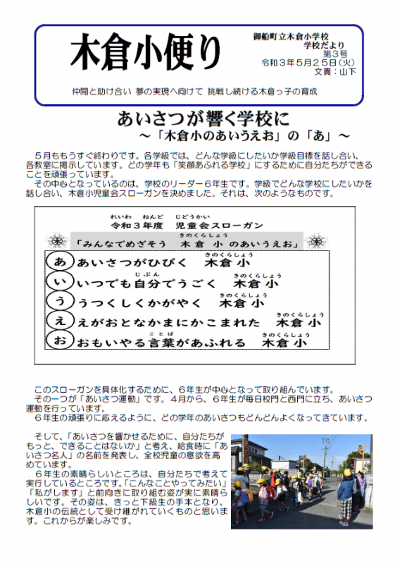 校長室便り 全ての記事 全ての記事 カテゴリ アーカイブ 2025年12月 (0) 2025年11月 (0) 2025年10月 (0) 2025年9月 (0) 2025年8月 (0) 2025年7月 (0) 2025年6月 (0) 2025年5月 (0) 2025年4月 (0) 2025年3月 (0) 2025年2月 (0) 2025年1月 (0) 2024年12月 (0) 2024年11月 (0) 2024年10月 (0) 2024年9月 (0) 2024年8月 (0) 2024年7月 (0) 2024年6月 (0) 2024年5月 (0) 2024年4月 (0) 2024年3月 (0) 2024年2月 (0) 2024年1月 (0) 2023年12月 (0) 2023年11月 (0) 2023年10月 (0) 2023年9月 (0) 2023年8月 (0) 2023年7月 (0) 2023年6月 (0) 2023年5月 (0) 2023年4月 (0) 2023年3月 (0) 2023年2月 (0) 2023年1月 (0) 2022年12月 (0) 2022年11月 (0) 2022年10月 (0) 2022年9月 (0) 2022年8月 (0) 2022年7月 (0) 2022年6月 (0) 2022年5月 (0) 2022年4月 (0) 2022年3月 (0) 2022年2月 (0) 2022年1月 (0) 2021年12月 (0) 2021年11月 (0) 2021年10月 (3) 2021年9月 (1) 2021年8月 (0) 2021年7月 (0) 2021年6月 (0) 2021年5月 (2) 2021年4月 (1) 5件 1件 5件 10件 20件 50件 100件 学校便り 第7号 投稿日時 : 2021/10/04 学校サイト管理者 学校便り 第7号「運動会に向けて/全国学力・学習調査」 R3 学校だより(第7号).pdf 0 {{options.likeCount}} {{options.likeCount}} {{options.unlikeCount}} {{options.unlikeCount}} 学校便り 第6号 投稿日時 : 2021/10/04 学校サイト管理者 学校便り 第6号「2学期が始まりました!」 R3 学校だより(第6号).pdf 0 {{options.likeCount}} {{options.likeCount}} {{options.unlikeCount}} {{options.unlikeCount}} 学校便り 第5号 投稿日時 : 2021/10/04 学校サイト管理者 学校便り 第5号「授業参観・教育講演会・学校運営協議会」 R3 学校だより(第5号).pdf 0 {{options.likeCount}} {{options.likeCount}} {{options.unlikeCount}} {{options.unlikeCount}} 学校便り 第4号 投稿日時 : 2021/09/29 学校サイト管理者 学校便り 第4号 「自ら進んで行動できる子に~「木倉小のあいうえお」の「い」~」 R3 学校だより(第4号).pdf 0 {{options.likeCount}} {{options.likeCount}} {{options.unlikeCount}} {{options.unlikeCount}} 学校便り 第3号 投稿日時 : 2021/05/25 学校サイト管理者 学校便り 第3号 「あいさつが響く学校に」 R3 学校だより(第3号).pdf 0 {{options.likeCount}} {{options.likeCount}} {{options.unlikeCount}} {{options.unlikeCount}} 12 »