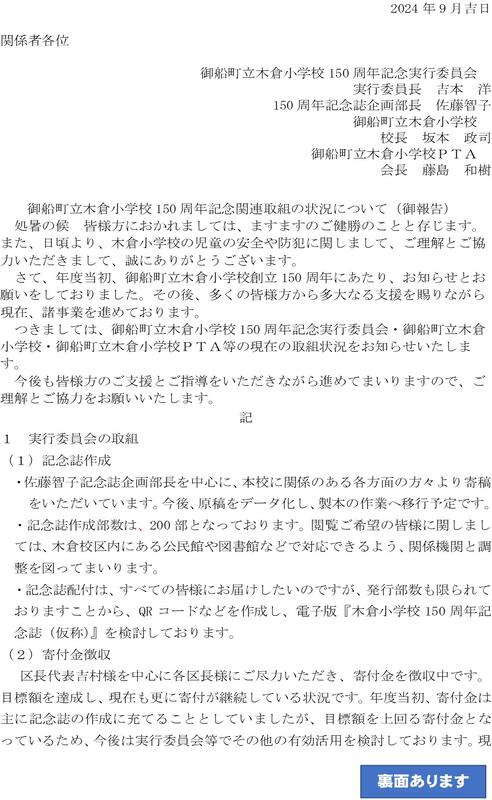 記念誌発行へ向けて寄付金のお願い 投稿日時 : 2024/06/17 学校サイト管理者 木倉小150周年寄付金依頼文書.pdf 0 {{options.likeCount}} {{options.likeCount}} {{options.unlikeCount}} {{options.unlikeCount}}