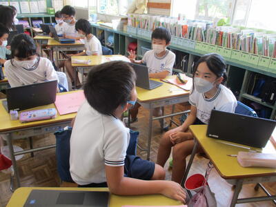 この日はいよいよ条約改正です。6年生社会科の学習は人物を中心に学習を進めていきますが、この日の歴史上の人物は陸奥宗光さんでした。陸奥宗光は不平等条約を改正するために大いに貢献された方です。6年生は教科書や資料集等を活用して自分自身で調べ学習をし、ペアやグループで出し合い、全体で学び合っていきました。