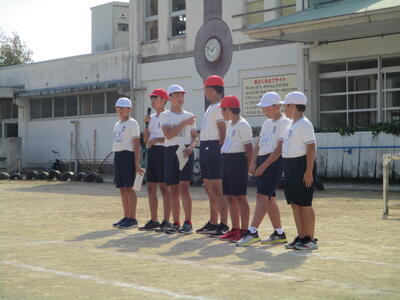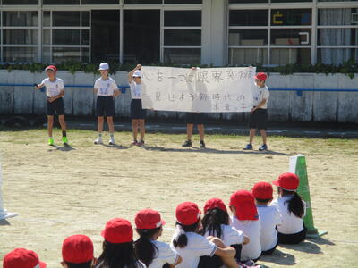 まず最初に、児童会運営委員の子ども達が今年の運動会のスローガンを全校児童に発表しました。今年のスローガンは「心を一つに 限界突破 見せよう 新時代の木倉っ子」です。運営委員に合わせて、全児童で大きな声で唱和しました。