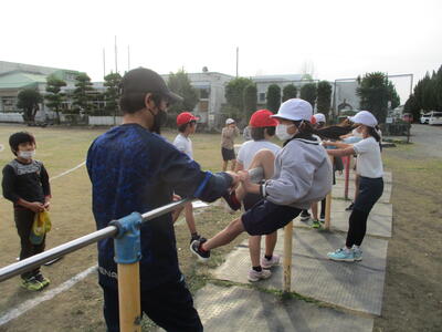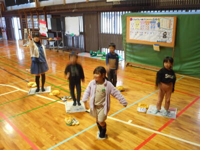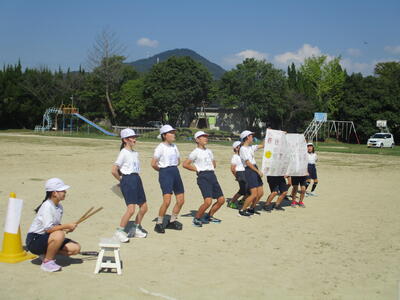 今日は、秋晴れの中、全児童でグランドに出てリズムジャンプを全校体育で行いました。リズムジャンプは軽快な音楽に乗ってゴムベルトをまたいだり、跳び越えたりしながら様々なバリエーションのジャンプをリズミカルにする運動遊びです。