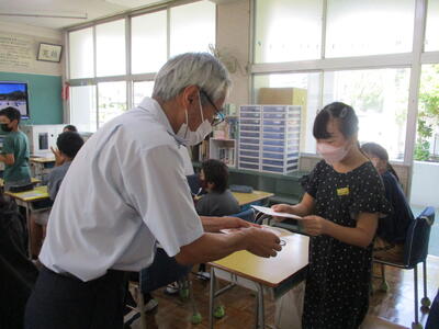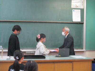 修了式は、理科室から配信された映像を各教室で子どもたちが見て参加しました。最初に、修了証渡しがありました。校長先生から通知表の最後にある「修了証」が各学年の代表の子どもたちに手渡されました。その後、校長先生の話がありました。
