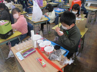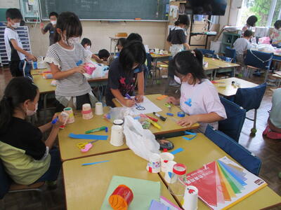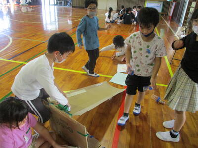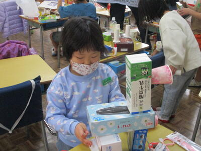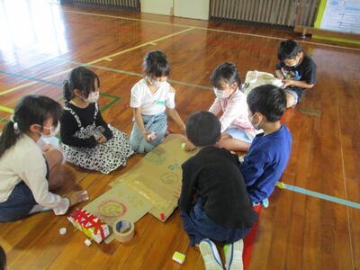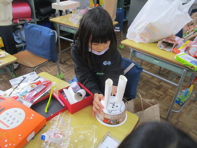 2年生の生活科は、「動くおもちゃをつくろう」に取り組んでいます。家庭にある様々な空き箱などを使って、楽しいおもちゃを協力して作っています。