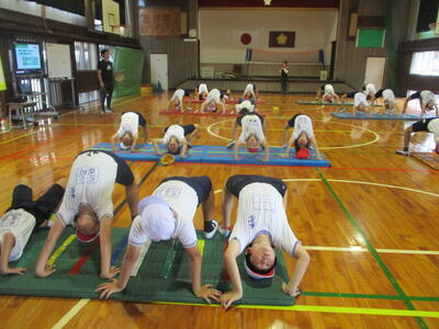 各教室へ映像を流し、練習しました。子ども達はすぐに思い出し、元気にストレッチをしました。初めて行う1年生は、6年生と一緒に体育館に入り、1年生と6年生のペアをつくり、6年生が1年生に優しく、丁寧に教えてくれて、とても温かい雰囲気に包まれていました。1年生もだんだんできるようになり、元気いっぱいでした。
