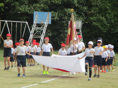 堂々とした入場行進、開会式の後は、プログラム1番、全児童での赤白応援合戦です。団長を中心に毎日放課後練習してきた成果を全力で発揮でき、感動的なスタートをきりました。