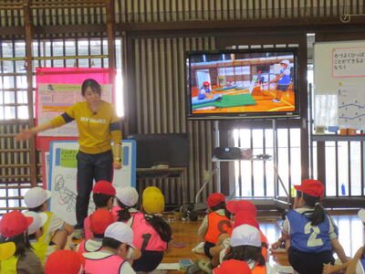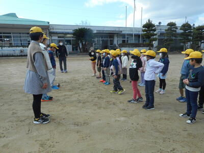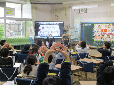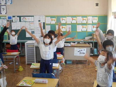 2年生の教室には体育委員会の5年生がミニ先生として入り、張り切って教えていました。次は運動場で全校児童でタオルストレッチを元気に行います。