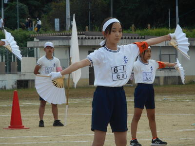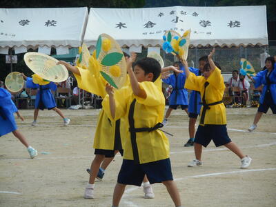 低学年は「花がさ音頭」で、花がさを上手に使い、かわいらしく踊りました。中学年は「伝われ 広がれ 木倉スマイル」で、手首に付けた色とりどりのボンボンが優雅にリズミカルに舞いました。途中には一輪車や旗も登場して盛り上げました。高学年は「よさこいソーラン~新時代の木倉っ子~」でした。木倉小をリードしてきた5、6年生の気持ちの揃った迫力満点のソーラン節は感動でした。さすがです。