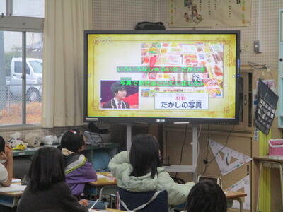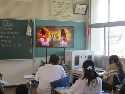 歴史学習では教科書、資料集に加え、映像を使って分かりやすく、そして楽しく歴史を学んでいます。今日も源平合戦の様子を迫力ある映像と分かりやすい解説で学びました。その中のポイントとなる歴史的な用語などを担任の先生が黒板に板書し、さらに押さえていきます。その中で担任が、源頼朝と義経の兄弟愛や悲しき最後、歴史の裏話などを巧みな話術で話していきます。子ども達はみんな目を丸くして授業に集中していました。
