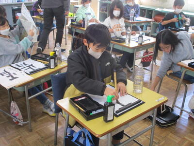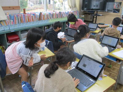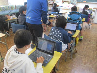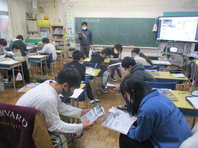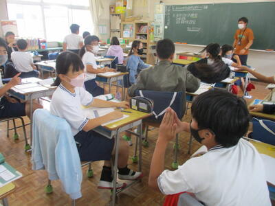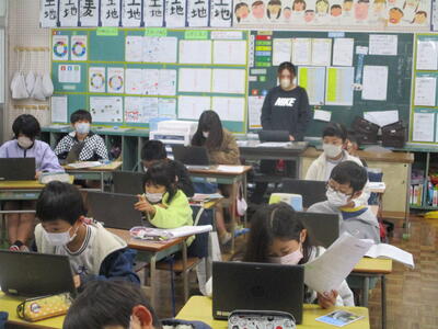 この日、5年生の教室では総合的な学習の時間に学んできたこと振り返りをしていました。5年生では「稲作体験学習」「水俣病学習」「環境学習」等、多くの学習を行ってきました。