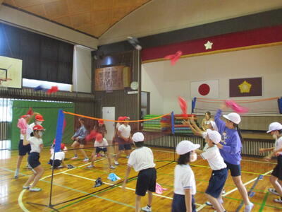 2年生は班ごとに、的あてや坂道、得点板などを作って、より動いて楽しくなる仕組み(おもちゃ)を用意しました。子ども達は、一生懸命にルールや遊び方を説明したり、モデルとなってやって見せたりと工夫をいっぱいして自分の思いを伝えていました。1年生も笑顔いっぱいにそれぞれの遊びを楽しみました。2年生も満足満足の笑顔でした。