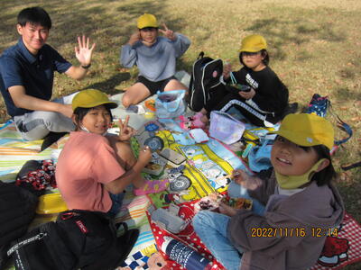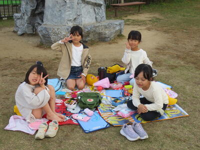 抜けるような青空の下、5年生を先頭に、学校を元気に出発しました。そして最後尾が今日の主役の6年生でした。町民グランドに到着すると5年生を中心に6年生を温かく迎えました。そしてお待ちかねのお弁当タイムです。
