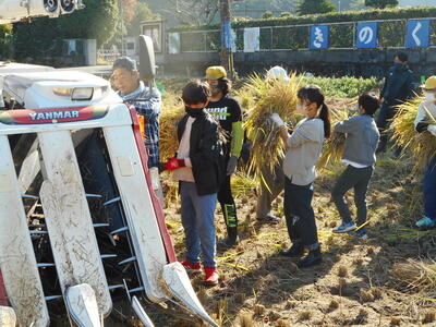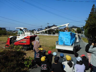 子ども達は、のこ鎌を上手に使い、一株一株丁寧に手で刈っていきました。刈り取った株はコンバインに運び、脱穀をしました。収穫したもち米は美味しいお餅にして、全児童やお世話になった地域の方々に振る舞われる予定です。福島さん本当にありがとうございました。
