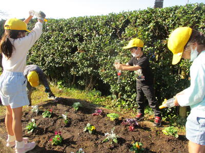暖かい日差しの中、1年生は自分たちの学級園の草を抜き、パンジーの花をみんなで植えました。