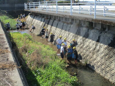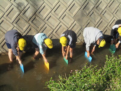 今日は、学校前の門前橋の下の小川にサンダルを履いて入り、水の中で様々な実験をしました。冷たい水の感触を楽しみながらみんな川の中に入っていきました。最初の実験は持ってきた粘土板を水の流れの中に垂直に立てて、水の流れの手ごたえを感じました。まずは緩やかな流れの場所で行い、次はやや流れの速い場所で行いました。「おーー」という声とともに流れの速さによる手ごたえの違いを実感していました。