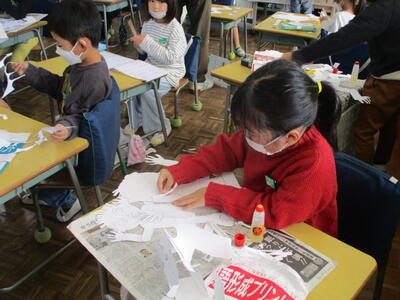 今日は、1年生が紙版画、6年生が木版画に取り組んでいました。1年生は画用紙をはさみで上手に切り取り、角度を考えて並べたり、重ねたりしておもしろい作品を一生懸命に制作していました。6年生は彫刻刀を使って、様々な線を工夫して彫っていました。動物の毛並みを細かく質感を出しながら丁寧に彫っている児童もいました。6年生では版木にインクを付けて一生懸命にバレンでこすって版画を完成させている児童もいました。