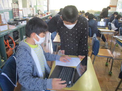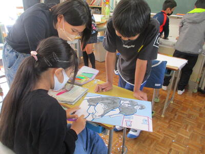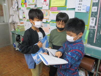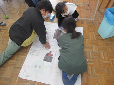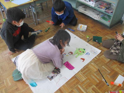 3年生の教室では、総合的な学習の時間に2月に行った町探検のことを思い出し、グループで壁新聞にまとめていました。