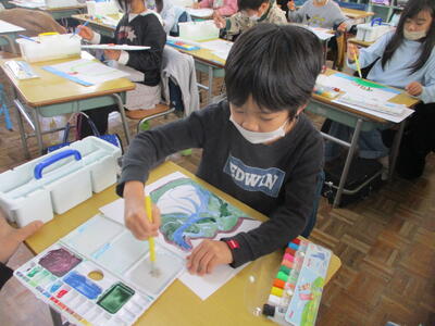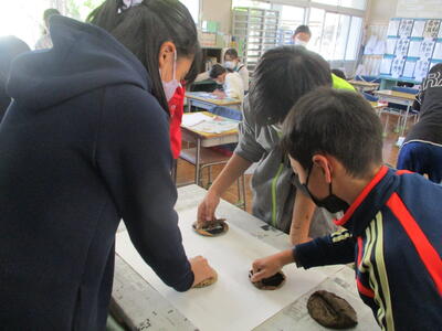 木倉小では1年~6年まで版画に取り組んでいます。1年、2年は紙版画、3年生は身の回りのものや自然のものを使った多色刷り版画、4年、5年、6年は木版画と学年の発達段階に応じた版画にチャレンジしています。