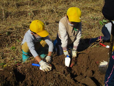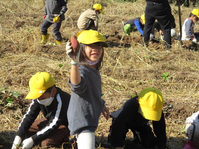 子ども達がいもが掘りやすいようにいもの蔓を事前に切っていただいた畑にみんな入りました。まず最初に、いもの掘り方のポイントを福島さんに教えていただき、いよいよいも掘りです。みんな小さな移植ごてを持ち、いものまわりの土を丁寧に掘り、どんどんいも全体を出していきました。そして一生懸命にいもを引き、大きなさつまいもが取れたときはみんな最高の笑顔でした。何個も連なったさつまいもが収穫されたりして驚きと笑顔いっぱいの畑でした。収穫したさつまいもはおうちに持って帰ったり、お世話になった方々へお礼の手紙を添えて渡したりします。