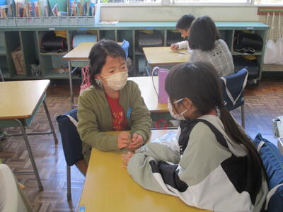 この日の業間活動は「にこにこタイム」でした。にこにこタイムは様々な生活場面を設定し、その時に相手の気持ちなどを考えて、どんな優しい言葉(ふわふわ言葉)をかけるか考える時間です。
