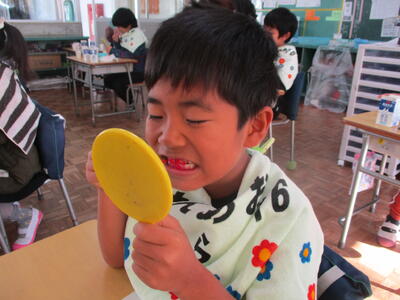 新1年生のお世話をするのは、来年度6年生になる5年生のみんなです。新入児のみんなは「ぱんだ」「こあら」「りす」「うさぎ」の4つのグループに分かれ、5年生の誘導とお世話で、視力、聴力、内科、歯科などの検査を上手に受けました。